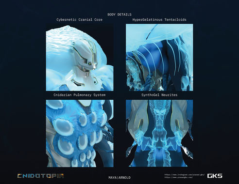 The Cnidaroids, cybernetic humanoid beings with cnidarian attributes, undergo radiation-induced metamorphosis, resulting in distinct features. Their cybernetic cranial cores integrate physiological and technological processes. Advanced augmentations include a filtration